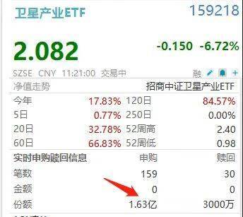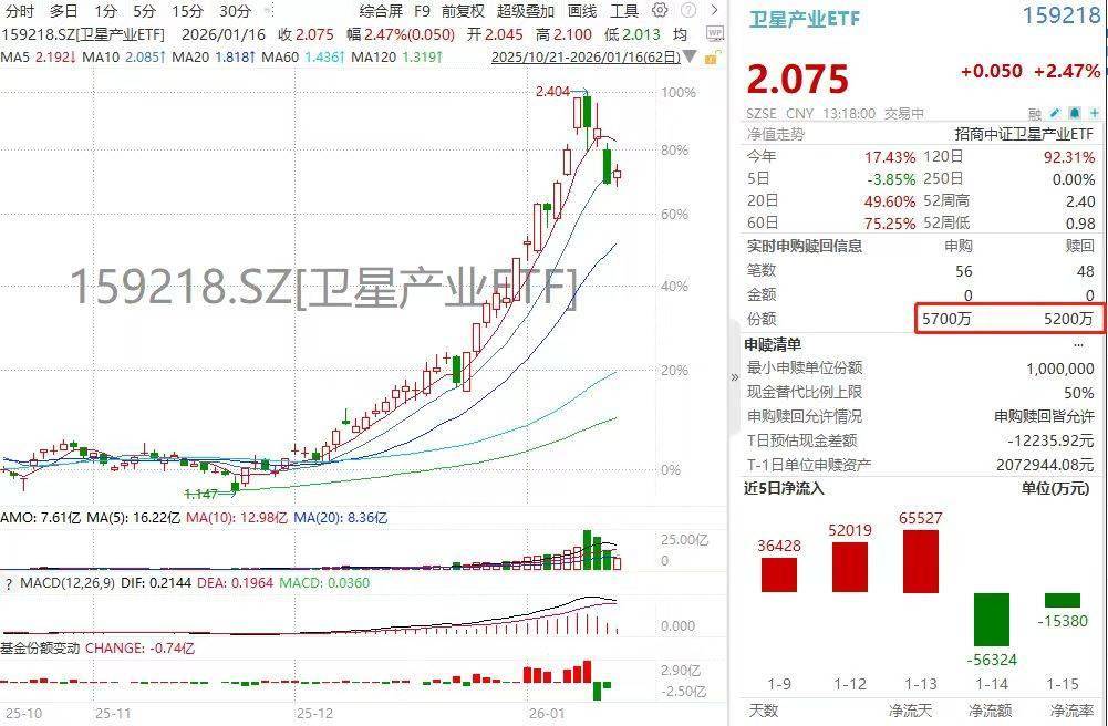 分析指出,本次调整是前期涨幅过大、估值透支与 "利好出尽"情绪集中释放共同作用的结果。自去年 末以来,板块在"商业航天第一股"上市预期、全球巨头激进技术愿景及国内星座组网计划等多重史诗级 催化下,走出了一轮脱离短期基本面的强劲行情,积累了丰厚的获利盘。当前,随着部分核心催化剂逐 步兑现,市场对产业长期高确定性与短期过高估值之间的平衡点进行重估,资金选择阶段性获利了结, 属于典型的技术性修正。 | 卫星产业ETF | | 159218 | | --- | --- | --- | | 2.082 | | -0.150 -6.72% | | SZSE CNY 11:21:00 交易中 | | ■ / @ + | | 净值走势 | 招商中证卫星产业ETF | | | 文年 17.83% 120日 | | 84.57% | | 5日 0.77% 250日 | | 0.00% | | 20日 32.78% 52周高 | | 2.40 | | 60日 66.83% 52周低 | | 0.98 | | 实时申购随回信息 | 由胸 | 陸回 | | 笔数 | 159 | 30 | | 全额 | 0 | 0 | | 份额 | 1 ...
