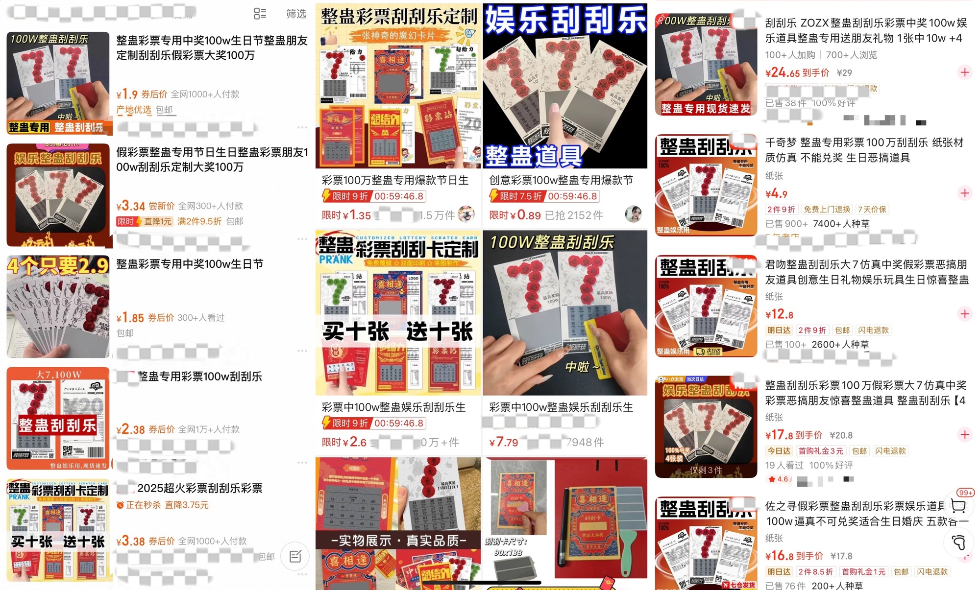 央广网北京10月28日消息(总台中国之声记者韩雪莹)据中央广播电视总台中国之声《新闻纵横》报道,近日,国家体育总局体育彩票管理中心发布声 明称,近期彩票市场出现有人持仿造即开型体育彩票(实为整蛊道具)前往体彩机构兑奖事件,严重扰乱了彩票市场秩序。记者调查发现,在各大电商平 台,"整蛊彩票"仍在公开销售。以道具之名销售"整蛊彩票",卖家、平台等各方需要承担法律责任吗?公众又该如何避免"中招"假彩票? 在社交媒体上,体验和推荐"整蛊彩票"的博主不在少数。 当给朋友拿出这张百万刮刮乐的时候,直接体验从泼天大富贵到幻梦都破碎…… 记者搜索发现,这类"道具彩票"在各大电商平台公开销售,且销量可观,通常设置"100万元""20万元""10万元""未中奖"等金额不等的选项。有商家在宣 传视频中介绍,产品"还原度直接拉满,票面材质、字体颜色、奖项设计和正规彩票一模一样,先让朋友体验一夜暴富的极致狂喜,再用隐藏小字解锁爆笑 反转,搞怪又不伤人"。 即开型体育彩票"7"与仿造彩票对比图(图源:青海省体育彩票发行中心) 实际上,这些"整蛊彩票"以即开型体育彩票为主。根据国家体育总局体育彩票管理中心发布的声明,即开型体育彩票使用环保 ...