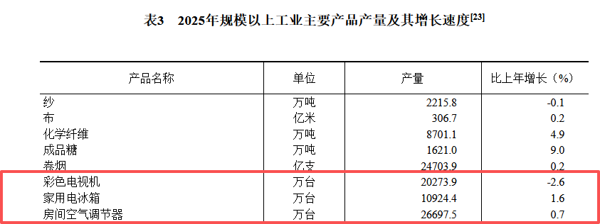 2月28日,国家统计局发布《中华人民共和国2025年国民经济和社会发展统计公报》。 2025年规模以上工业中,农副食品加工业增加值比上年增长5.6%,纺织业增长3.0%,化学原料和化学制品制造业增长 7.8%,非金属矿物制品业下降0.6%,黑色金属冶炼和压延加工业增长4.5%,通用设备制造业增长8.0%,专用设备制造 业增长4.3%,汽车制造业增长11.5%,电气机械和器材制造业增长9.2%,计算机、通信和其他电子设备制造业增长 10.6%,电力、热力生产和供应业增长2.2%。 | 产品名称 | 单位 | 产量 | 比上年增长(%) | | --- | --- | --- | --- | | 彩 | 万吨 | 2215.8 | -0.1 | | ff | 亿米 | 306.7 | 0.2 | | 化学纤维 | 万吨 | 8701.1 | 4 d | | 成品糖 | 万吨 | 1621.0 | 9.0 | | 卷烟 | 亿专 | 24703.9 | 0.2 | | 彩色电视机 | 万台 | 20273.9 | -2.6 | | 家用电冰箱 | 万台 | 10924.4 | 1.6 | | 房间空气调节器 | 万 ...