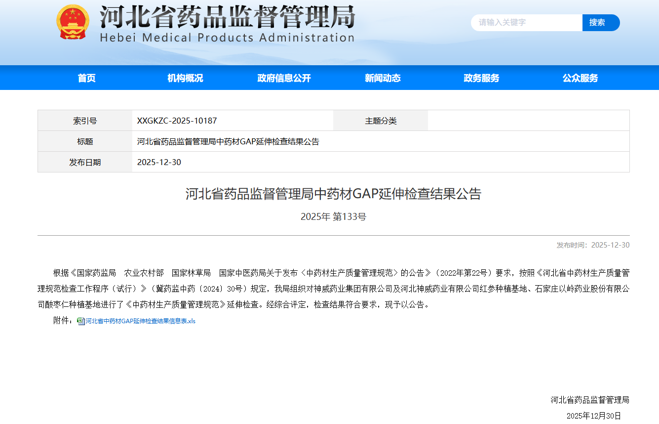 河北省药品监督管理局日前发布《河北省药品监督管理局中药材GAP延伸检查结果公告》,以岭药业(002603)酸枣仁种植基地通过河北省药监局组织的 GAP延伸检查,综合评定符合要求。这是全国第一个通过GAP延伸检查的酸枣仁基地。 以岭药业以《中药材生产质量管理规范》(新版GAP)为指引,打造酸枣仁规范化基地,坚持规范化、生态化及野生抚育种植的建设理念,依据中药材GAP 相关要求,按照"六统一""可追溯"的具体要求建立了完善的质量管理体系和质量标准,并拥有先进的全过程追溯管理体系,对酸枣仁基地进行规范化管理, 从源头保障酸枣仁药材质量。 基地建设不仅促进了当地中药材种植产业的快速健康发展,助力打酸枣仁特色产业优势区,还带动了当地农民增收致富,真正使酸枣仁变成了甜产业。 以岭药业秉承药品质量重于泰山,人民生命高于一切的质量理念,在中药材种养殖领域持续发力,在全国范围内选择道地产区,通过自建、共建、共享等方 式,创建60个规模化、标准化的中药材种养殖基地,遍布20个省区,从源头保障药材质量。 | | | | | 中药材GAP延伸检查结果信息表 | | | | | --- | --- | --- | --- | --- ...