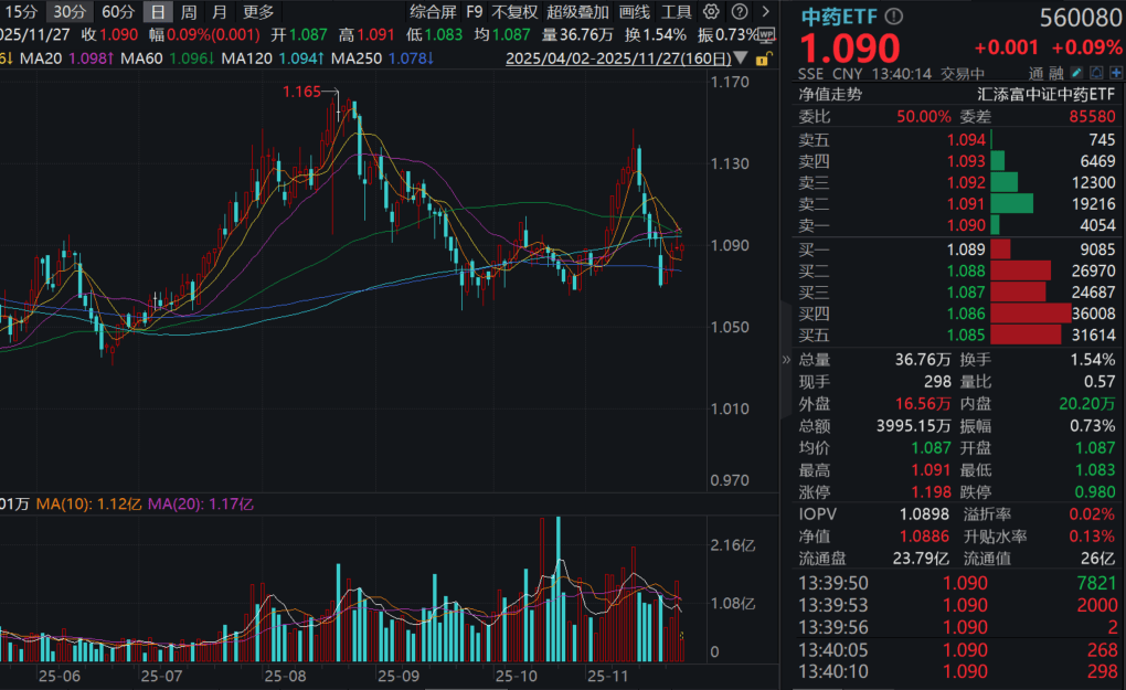近期国内多地流感季用药需求激增,今日(11.27),中药板块探底回升,中药ETF(560080)一度飘红,盘中成交额已超4600万元!截至11月26日,中药 ETF(560080)最新规模25.9亿元,同类断层领先! 消息面上,当前全国进入流感流行季,中国疾病防控中心研究员表示,监测数据显示,往年开始进入流感流行季的时间一般都是在10—11月,流行高峰的时 间一般出现在12月中下旬和1月初。抗感冒药物市场需求迅速升温,美团买药数据显示,11月以来平台相关药品订单量环比增长超一倍,中成药因整体调 节、副作用温和等特点成为家庭首选。 中药ETF(560080)标的指数成分股涨跌互现:粤万年青涨超10%,太龙药业涨超2%众生药业涨超1%;下跌方面,以岭药业、白云山、片仔癀、华润三九 微跌。市场观点认为,粤万年青的大涨可能受公司治理结构优化、核心产品参芪降糖片销量增长并成功进入全国集采、流感疫情高发带动抗病毒药物需求激 增催化。 | 序号 | 代码 | 名称 | 估算权重 | 涨跌幅 | 成交额 ▼ | | --- | --- | --- | --- | --- | --- | | 1 | 002317 | 众生药业 ...