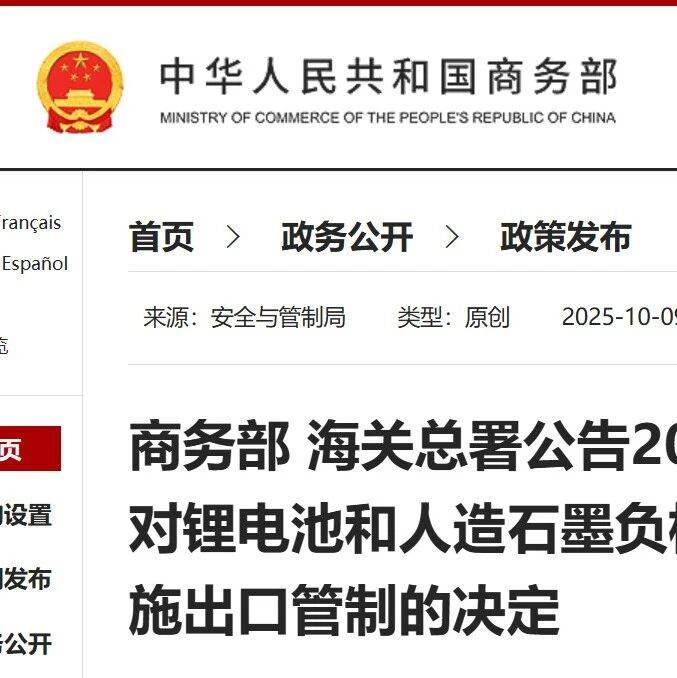 突发!商务部、海关总署:对高能量密度锂电池/正负极材料/部分锂电设备等相关物资实施出口限制!