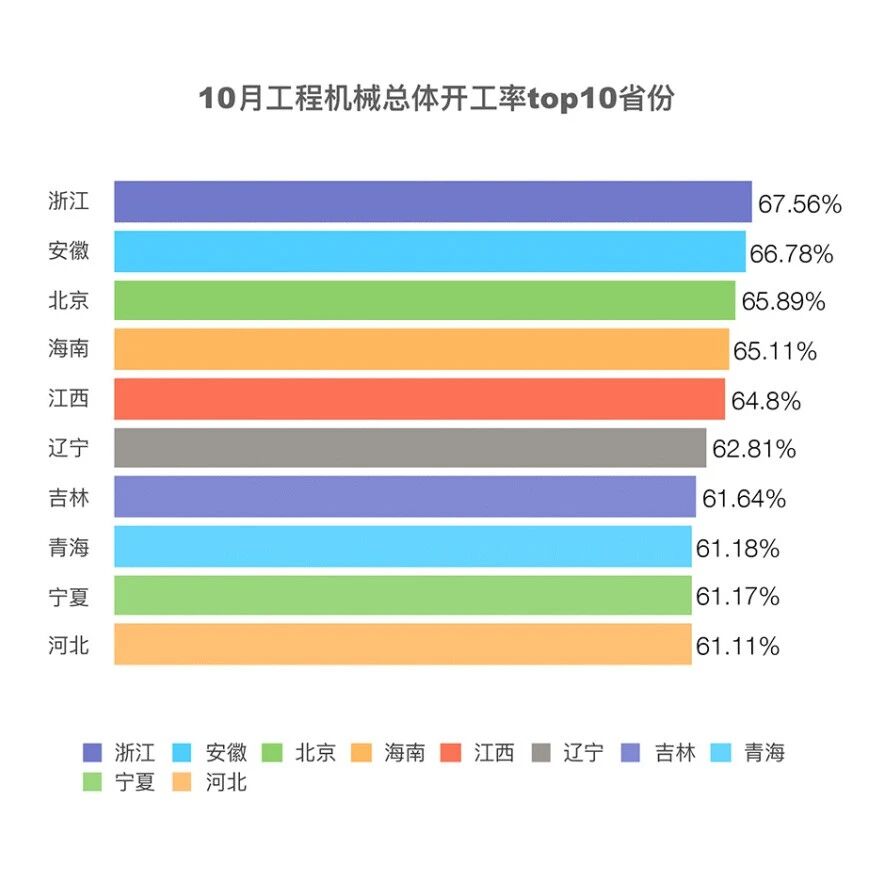Core Insights - In the first half of 2025, national infrastructure investment showed a "blossoming" trend, with an average construction rate of 44.81% for engineering machinery, and a second-quarter rate of 47.1%, reflecting a 4.62% increase from the first quarter [1][4] Group 1: Regional Performance - Six provinces, including Anhui, Fujian, Henan, Jiangxi, Zhejiang, and Chongqing, maintained a construction rate above 50% for six consecutive months, indicating robust infrastructure investment, particularly in East and South China [4][5] - The average construction rate for 15 provinces increased compared to the same period last year, showcasing higher activity levels in infrastructure projects, which supports local economic stability and development [5][8] Group 2: Equipment Utilization - In the first half of 2025, the average construction rate for hoisting equipment was 66.87%, the highest among all equipment categories, with top-performing provinces including Anhui, Hubei, and Jiangxi [7][8] - The central region had the highest overall construction rate at 50.13%, with Anhui leading at 66.24%, followed by Jiangxi and Henan [8][9] Group 3: Regional Highlights - The western region's construction rate was 48.45%, benefiting from the "Belt and Road" initiative, with significant projects in energy and transportation [11] - The northeastern region showed a construction rate of 45.68%, with notable increases in the utilization of stackers and crawler cranes, indicating a recovery in economic activity [13] - The eastern region's construction rate was 45.58%, with concrete equipment leading in utilization, reflecting strong demand for construction activities [15]