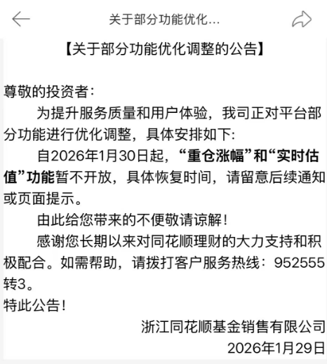 同花顺app暂停“重仓涨幅”和“实时估值”功能
