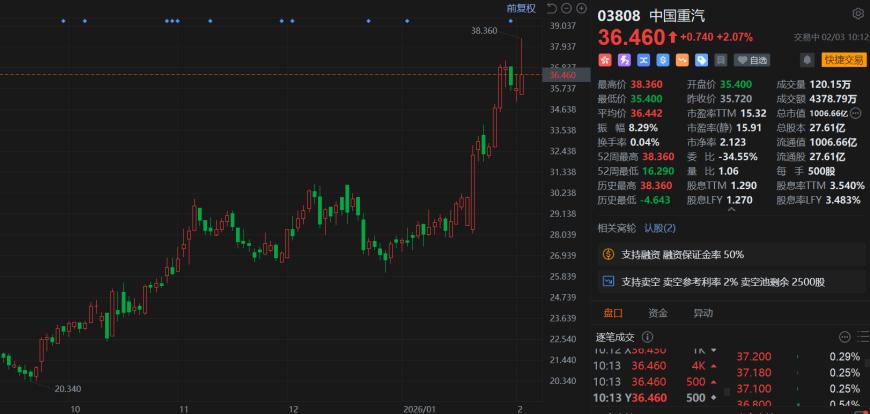 港股异动丨中国重汽大涨超7%创新高 2025年重卡销量突破30万 登顶全球重卡之巅