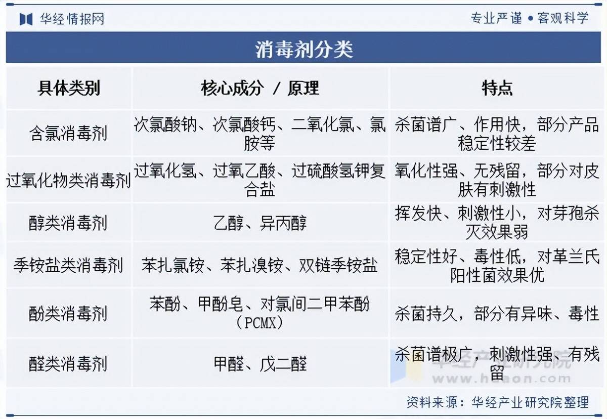 消毒剂用于杀灭传播媒介上病原微生物,使其达到无害化要求,将病原微生物消灭于人体之外,切断传染病的传播途径,达到控制传染病的目的。 一、消毒剂分类 | | ■ 华经情报网 | 专业严谨 · 容对 | | --- | --- | --- | | 消毒剂分类 | | | | 核心成分 / 原理 | 具体类别 | 特点 | | 次氯酸钠、次氯酸钙、二氧化氯、氯 杀菌谱广、作用快, 部 | 含氯消毒剂 | | | 按手 | | 稳定性较差 | | 十三代物半半まったり乱化室、 以乳と酸、 过硫酸氢研复 契化性症、 元残留, 能 | 合計 | 肤有刺激性 | | 乙醇、异丙醇 | 醇类消毒剂 | 挥发快、刺激性小,对 火效果弱 | | 苯扎氯铵、苯扎溴铵、双链季铵盐 | 季铵盐类消毒剂 | 稳定性好、毒性低,对 | | | | 阳性菌效果优 | | 苯酚、甲酚皂、对氯间二甲苯酚 | 酚类消毒剂 | 杀菌持久,部分有异味 | | (PCMX) | | | | 甲醛、戊二醛 | 醛类消毒剂 | 杀菌谱极之,刺激性强 | | | | www.haon.co | | | | 资料来源:华经产业研究》 | 二、消毒剂行业主要产业政 ...