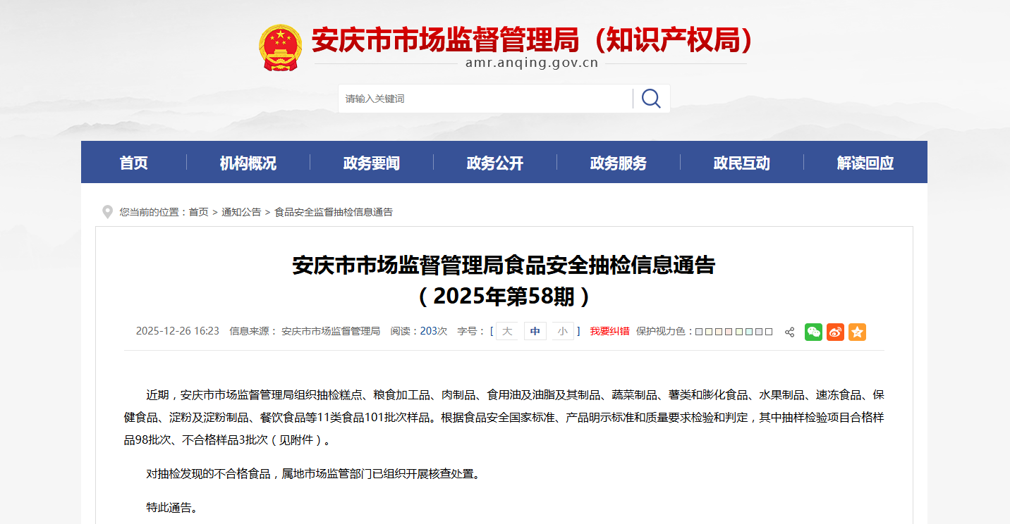 安徽省安庆市市场监督管理局食品安全抽检信息通告(2025年第58期)