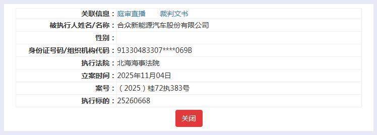 Core Viewpoint - The article highlights the financial distress of Hezhong New Energy, the parent company of Nezha Auto, indicating significant legal and financial challenges, including a total execution amount exceeding 25.91 million yuan and ongoing bankruptcy restructuring efforts [1][3][8]. Group 1: Legal and Financial Issues - Hezhong New Energy has recently been listed as a defendant in a legal case with an execution amount exceeding 25.26 million yuan, filed by the Beihai Maritime Court on November 4 [1]. - The total amount of executions against Hezhong New Energy is approximately 25.91 million yuan [3]. - The company faces multiple risk factors, including consumption restrictions, administrative penalties, and equity freezes [4]. Group 2: Company Background and Financial Performance - Hezhong New Energy was established in October 2014, with total investments exceeding 10 billion yuan and a workforce of over 7,000 employees, holding more than 3,500 patents [8]. - Nezha Auto, launched in 2018, is a smart electric vehicle brand under Hezhong New Energy [8]. - The company reported net losses of 4.84 billion yuan, 6.666 billion yuan, and 6.867 billion yuan for the years 2021 to 2023, totaling over 18.3 billion yuan in losses [8]. - On June 12, the Jiaxing Intermediate People's Court accepted the bankruptcy reorganization case of Hezhong New Energy, appointing multiple law firms as joint administrators [8].