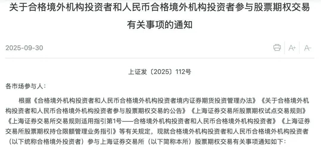 来源:期权时代 01 今年6月,中国证监会发布公告称,将从2025年10月9日起允许合格境外投资者参与场内ETF期权交易,交易目的限于套期保值。 9月30日晚间,上交所通知,即日起开始受理合格境外投资者参与股票期权交易的业务办理申请,深交所也通知称,自10月9日起开始受理合格境外投资者 参与股票期权交易的业务办理申请。中国结算也同日发布通知各结算参与人做好业务技术准备。 今年以来,中国证监会先后放宽合格境外投资者参与境内商品期货、商品期权和ETF期权等产品的限制。此举旨在持续拓展合格境外投资者可投资范围, 发挥合格境外投资者制度的优势和吸引力,便利境外机构投资者特别是配置型资金运用适配的风险管理工具,有利于提升外资机构投资行为的稳定性,促 进其对A股的长期投资。 02 合格境外投资者参与ETF期权交易将于国庆假期后A股市场第一个交易日起(10月9日)正式实施。 9月30日,上交所、深交所分别发布《关于合格境外机构投资者和人民币合格境外机构投资者参与股票期权交易有关事项的通知》。 《通知》称,合格境外投资者可以参与在沪深交易所上市的交易型开放式指数基金期权(ETF期权)交易,交易目的限于套期保值。 合格境外投资 ...