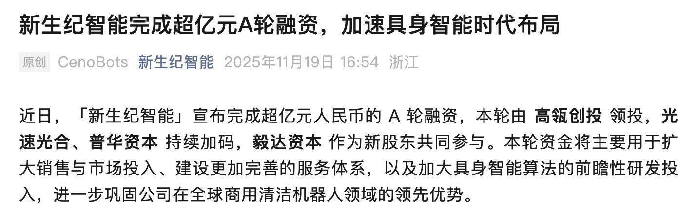 瑞财经 吴文婷11月19日,新生纪智能宣布完成超亿元的A轮融资,本轮由高瓴创投领投,光速光合、普华资本持续加码,毅达资本作为新股东共同参与。 本轮资金将主要用于扩大销售与市场投入、建设更加完善的服务体系,以及加大具身智能算法的前瞻性研发投入,进一步巩固公司在全球商用清洁机器人领 域的领先优势。 公开资料显示,新生纪智能成立于2022年2月,是一家全栈自研技术驱动的具身智能通用服务机器人企业。 公司整合研发、设计、生产、销售全链条能力,聚焦万亿级商用服务场景,致力于打造下一代智能、可靠、无忧的清洁机器人,让先进清洁方案触达所有潜 在客户。目前,新生纪智能已在新加坡、美国、荷兰及中国设立子公司,完成全球主要市场的业务布局。 而公司创始人王刚博士的深厚背景与实战经验,是新加坡南洋理工大学终身教授,其在学术生涯中先后师从人工智能科学家李飞飞、计算机科学家 DavidForsyth及DerekHoiem,更曾被麻省理工大学评为"全球35名35岁以下能改变世界的青年创新者"之一。 王刚博士创业前曾在阿里巴巴集团担任重要职务,先后出任阿里副总裁、人工智能实验室首席科学家、达摩院自动驾驶实验室负责人。 ...