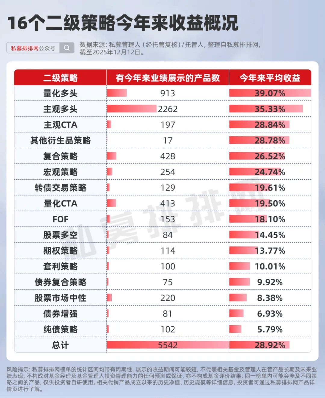 本文首发于公众号"私募排排网"。 (点击↑↑ 上图查看详情 ) 私募排排网显示,截至2025年12月12日,有今年来业绩展示的复合策略产品共有428只,数量仅次于量化多头策略和主观多头策略。从业绩层面 来看,在16个二级策略中,复合策略今年来平均收益为26.52%,位列第5。 | 二级策略 | 有今年来业绩展示的产品数 | 今年来平均收益 | | --- | --- | --- | | 를化务杀 | 913 | 39.07% | | 主观多头 | 2262 | 35.33% | | 主观CTA | 197 | 28.84% | | 其他衍生品策略 | 17 | 28.78% | | 复合策略 | 428 | 26.52% | | 宏观策略 | 254 | 24.74% | | 转债交易策略 | 129 | 19.61% | | 量化CTA | 413 | 19.50% | | FOF | 153 | 18.10% | | 股票多空 | 84 | 14.45% | | 期权策略 | 114 | 13.77% | | 套利策略 | 100 | 10.01% | | 债券复合策略 | 75 | 9.92% | | ...