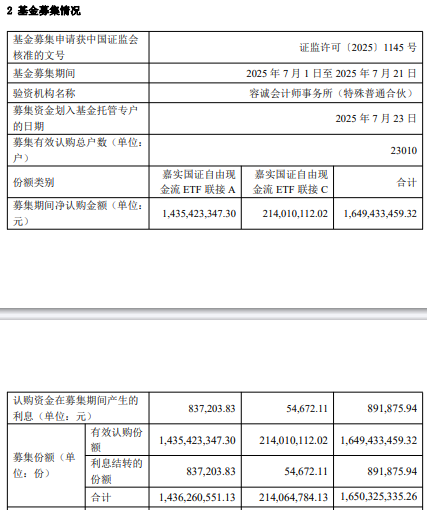 | 基金募集申请获中国证监会 核准的文号 | | 证监许可〔2025〕 1145 号 | | | --- | --- | --- | --- | | 基金募集期间 | | 2025年7月1日至2025年7月21日 | | | 验资机构名称 | | 容诚会计师事务所(特殊普通合伙) | | | 募集资金划入基金托管专户 的日期 | | | 2025年7月23日 | | 募集有效认购总户数(单位: | | | 23010 | | 户) | | | | | 份额类别 | 嘉实国证自由现 | 嘉实国证自由现 | 合计 | | | 金流 ETF 联接 A | 金流 ETF 联接 C | | | 墓集期间净认购金额(电位: | 1.435.423.347.30 | 214.010.112.02 | 1.649.433.459.32 | | 元) | | | | 中国经济网北京7月24日讯 今日,嘉实基金发布嘉实国证自由现金流交易型开放式指数证券投资基 金联接基金基金合同生效公告。 | 认购资金在募集期间产生的 | | 837,203.83 | 54,672.11 | 891,875.94 | | --- | --- | ...