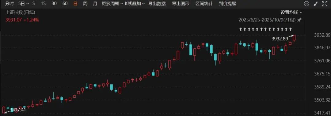 10月9日,是国庆长假后首个交易日,A股全面高开高走,上证指数突破3900点,再创10年新高,科创50则盘中大涨逾6%,创4年多来新高,深证成指、 创业板指、沪深300等也纷纷创出多年新高。市场成交呈快速放大趋势,开盘不到1小时成交就超过万亿元。 时隔10年,上证指数再次突破3900点。科创50盘中大涨逾6%。 我国可控核聚变领域亦再迎重大进展,位于安徽合肥的紧凑型聚变能实验装置(BEST)项目建设取得关键突破。 国际能源署日前发布的《2025年可再生能源》报告预测,未来5年全球可再生能源新增装机容量将达到之前5年增量的两倍。2025至2030年期间,全球可再 生能源装机容量将增加4600吉瓦,大致相当于中国、欧盟和日本当前装机容量总和。 | 名称 | 序号 | 现价 | 涨跌 | 涨跌幅 | | --- | --- | --- | --- | --- | | 上证指数 | 1 | 3931.07 | 48.29 | 1.24% | | 深证成指 | 2 | 13763.88 | 237.37 | 1.75% | | 北证50 | 3 | 1532.43 | 3.80 | 0.25% | | 万得全A | 4 ...