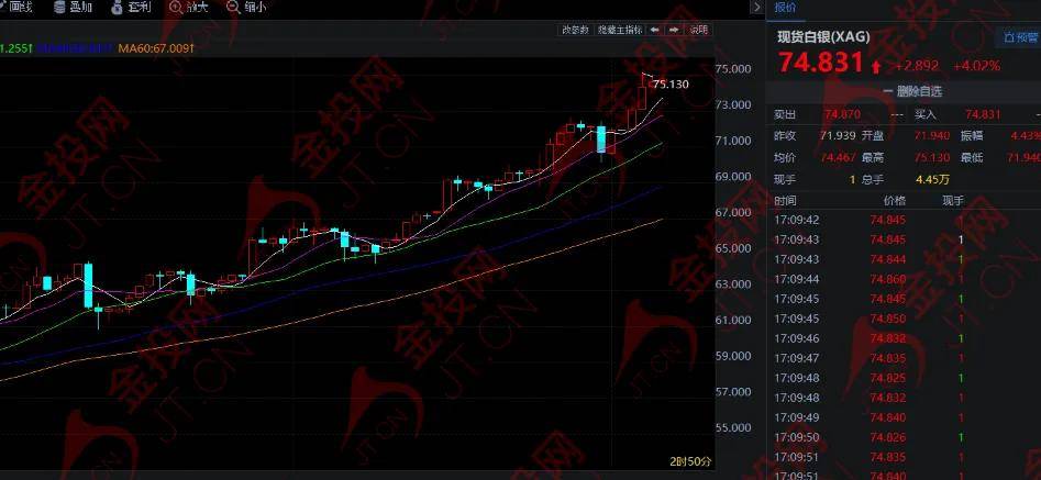 12月26日,现货白银首次突破75美元/盎司,再创历史新高。截至发稿,现报74.8美元/盎司,日内涨4.35%。 | W | | | COMEX自银 | | | | | --- | --- | --- | --- | --- | --- | --- | | | | | SI.CMX | | | | | 74.800 | | 昨结 | 71.685 | 7 22 | | 73.030 | | +3.115 | +4.35% | 总手 | 3.69万 | 现手 | | 1 | | 最高价 | 75.495 | 持 仓 | O | 外 温 | | 1.78万 | | 最低价 | 73.030 | 增 仓 | -11.29万 | R র প্রায় | | 1.92万 | | 分时 | 五日 | нк | 围K | 月K | 申名 | | | 叠加 | | | | | 盘口 | | | | | | | 5.31% 571 | 74.800 | T | | | | | | 11 | 74.785 | 3 | | | | | | 23:42 74.765 | | 71 | | | | | | 23:42 74.770 ...