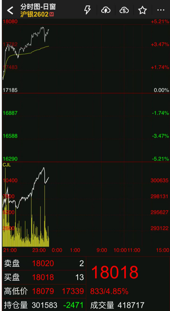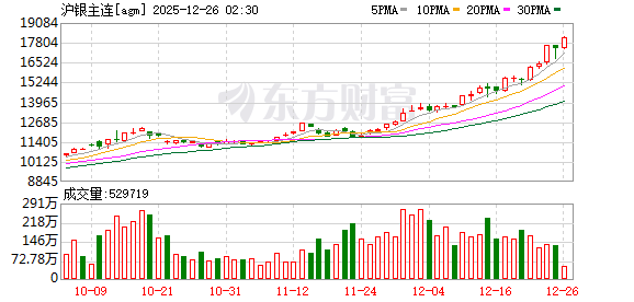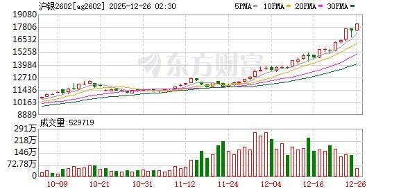来源:中国基金报 【导读】沪银暴涨创新高 中国基金报记者 泰勒 大家好,今晚美国那边过圣诞节,股市休市,我们简单看点别的消息。 沪银创下新高 12月25日晚间,贵金属期货走强,沪银夜盘涨超18000元/千克,创历史新高,当前涨幅接近5%。 | 分时图-日窗 | | 9 | 4 45 | 2 | | | --- | --- | --- | --- | --- | --- | | 沪银2602网 | | | | | | | 18080 | | | | | 45.21% | | | | | | | 43.47% | | | | | | | +1.74% | | 17185 | | | | | 0.00% | | 16887 | | | | | -1.74% | | 16588 | | | | | -3.47% | | 16290 | | | | | -5.21% | | CJL | | | | | | | 0400 | | | | | 300635 | | | | | | | 298131 | | | | | | | 295627 | | | | | | | 293122 | | 0:00 1:00 | | | 9 ...