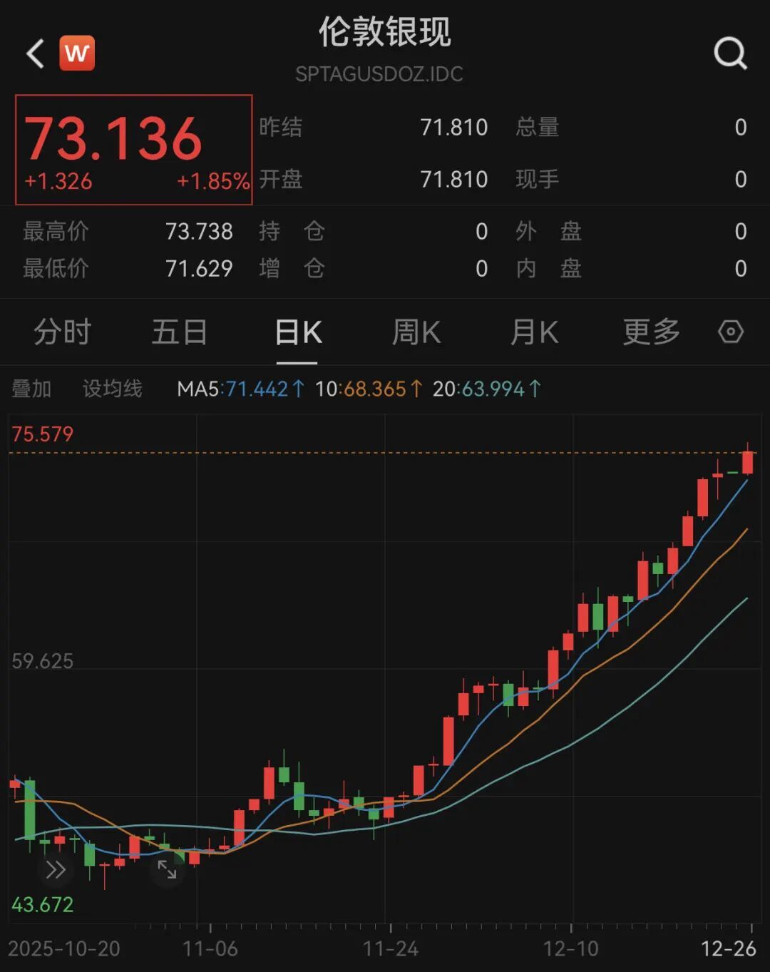 12月26日早间,现货白银跳空高开,突破73美元/盎司,再创历史新高。截至发稿,报73.649美元/盎司,涨2.56%。 | W | | | 伦敦银现 | | | | | | --- | --- | --- | --- | --- | --- | --- | --- | | | | | SPTAGUSDOZ.IDC | | | | | | 73.649 | | 昨结 | 71.810 | 总量 | | | O | | +1.839 | +2.56% 开盘 | | 71.810 | 现手 | | | 0 | | 最高价 | 73.788 | 持 仓 | 0 | Ar | 智 | | 0 | | 最低价 | 71.629 | 壇 仓 | 0 | 内 | श्री | | O | | 十日本 | 五日 | 日K | 居く | 月K | | 原因 | | | 鲁加 | | | | 均价:0.000 | | | | | 73.788 --- | | | | --------2.75%- | द्रो | 73.692 73.649 | | | | | | | | 8:21 | 73.652 | O | | | | | ...