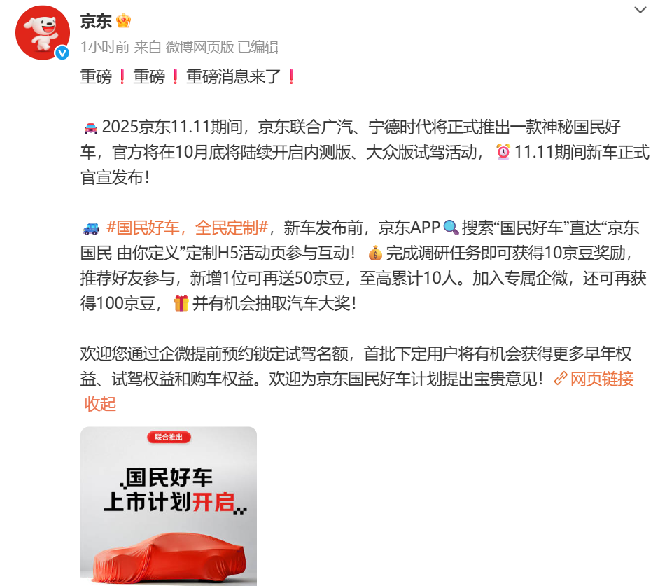 京东宣布联合宁德时代、广汽推“国民好车”,双11开售