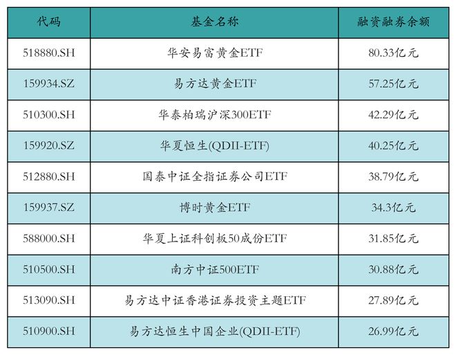 | 代码 | 基金名称 | 融资融券余额 | | --- | --- | --- | | 518880.SH | 华安易富黄金ETF | 81.02亿元 | | 159934.SZ | 易方达黄金ETF | 57.3亿元 | | 510300.SH | 华泰柏瑞沪深300ETF | 40.77亿元 | | 159920.SZ | 华夏恒生(QDII-ETF) | 40.42亿元 | | 512880.SH | 国泰中证全指证券公司ETF | 37.32亿元 | | 159937.SZ | 博时黄金ETF | 35.2亿元 | | 510500.SH | 南方中证500ETF | 34.57亿元 | | 512100.SH | 南方中证1000ETF | 28.53亿元 | | 588000.SH | 华夏上证科创板50成份ETF | 28.09亿元 | | 513090.SH | 易方达中证香港证券投资主题ETF | 27.99亿元 | ETF融资买入额 市场概况 11月13日两市ETF两融余额为1187.34亿元,较前一交易日减少50.03亿元。其中融资余额为1102.92亿 元,较前一交易日减少51.0亿 ...