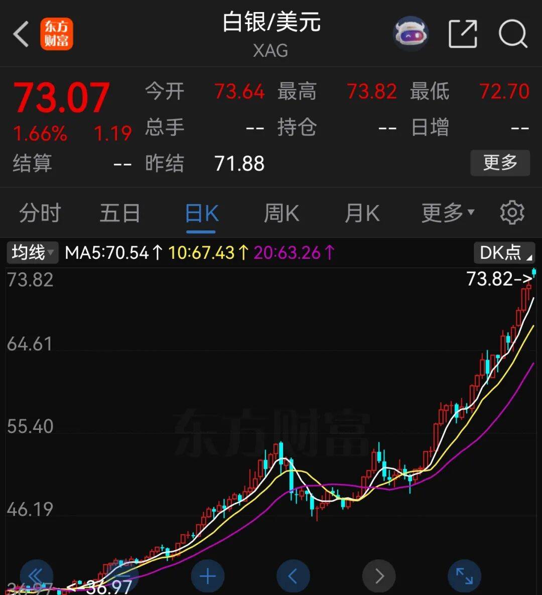 白银,又涨了 12月26日,现货白银跳空高开。截至7时08分,现货白银涨幅扩大至2%,报73.422美元/盎司,再创历史新高。 现货钯金日内涨超2%,现报1728.79美元/盎司。 连续暴涨 买它等于"白捡钱"? 国投瑞银白银期货(LOF)12月25日发布公告称,12月29日起,限制本基金A类基金份额定期定额投资金额为100.00元。 公开资料显示,国投白银LOF成立于2015年8月,由国投瑞银基金管理有限公司(简称"国投瑞银")管理,主要投资于白银期货主力合约,业绩比较基准 为上海期货交易所白银期货主力合约收益率。截至2025年三季度末的规模为28.27亿元。 数据显示,国投白银LOF在短短22个交易日涨幅超100%,年内涨幅已经超250%,远超同期白银期货单月涨幅35.11%和年内涨幅129.21%。 该基金曾多次调整投资额度。10月15日,国投白银LOF基金公告称,A类份额及C类份额的定期定额投资金额上限分别为6000元和40000元;10月20日,国 投白银LOF基金再次发布公告,继续收紧了限购金额,A类份额及C类份额的定期定额投资金额上限分别为100元和1000元;12月19日,国投白银LOF基金 ...