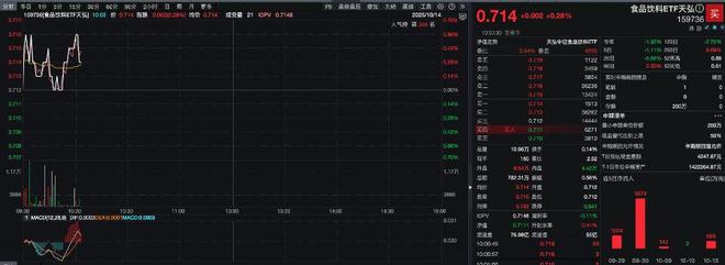 10月14日,食品饮料ETF天弘(159736)盘中走势震荡,截至发稿涨0.28%,成交额超780万元。Wind 金融终端数据显示,该ETF获200万份实时净申购。 成分股方面,粤桂股份涨停,酒鬼酒、舍得酒业、金徽酒、会稽山等跟涨。 资金流向上,Wind金融终端数据显示,食品饮料ETF天弘(159736)昨日获资金净流入,拉长时间线 看,该ETF近10个交易日有9日获资金净流入,累计"吸金"超1.5亿元。 食品饮料ETF天弘(159736)紧密跟踪中证食品饮料指数,该指数以中证全指为样本空间,选取归属于 饮料、包装食品与肉类两个行业的上市公司股票作为成分股。此外,食品饮料ETF天弘(159736)还配 置了场外联接基金(A: 001631;C: 001632)。 消息面上,据港交所10月9日披露,东鹏饮料(集团)股份有限公司(605499.SH)向港交所主板提交上市 申请书,华泰国际、摩根士丹利、瑞银集团为联席保荐人。 华龙证券10月13日研报表示,上周,飞天茅台(散瓶)批价从1760元/瓶上涨5元/瓶至1765元/瓶;飞天 茅台(原装)批价从1780元/瓶上涨15元/瓶至1795元/瓶。普五(八代)52度批 ...