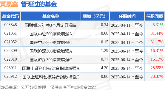 | 賃金代码 | 基金名称 | 规模(亿元) 任职时间 | 任职回报 | | --- | --- | --- | --- | | 008848 | 国联智选对冲3个月定开混合 | 0.34 2025-04-11~至今 | -5.31% | | 021051 | 国联中证500指数增强A | 0.60 2025-04-11 ~ 至今 | 31.44% | | 021052 | 国联中证500指数增强C | 0.15 2025-04-11 ~ 至今 | 31.17% | | 022309 | 国联沪深300指数增强A | 1.29 2025-06-14 ~ 至今 | 16.31% | | 022310 | 国联沪深300指数增强C | 0.77 2025-06-14~至今 | 16.17% | | 023911 | 国联上证科创板综合指数增强A | 4.30 2025-06-14~至今 | 28.55% | | 023912 | 国联上证科创板综合指数增强C | 0.86 2025-06-14~至今 | 28.37% | 以上内容为证券之星据公开信息整理,由AI算法生成(网信算备31010434571030124 ...