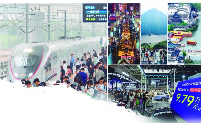 旅客在江苏无锡火车站准备乘车 游客在宁夏银川市鼓楼步行街游玩 游客在重庆奉节三峡之巅游览 游客在南京夫子庙景区游览 市民在2025第46届中国(福州)国际汽车博览会现场观看车商的促销活动 本版图片均为新华社图 郭 晨凯 制图 供需双轮驱动 服务消费增长潜力持续释放 ◎记者 陈芳 刚刚过去的国庆中秋长假,国内出游达到8.88亿人次,全社会跨区域人员流动量日均超过3亿人次,"流 动的中国"不仅展现出勃勃生机,而且激发了旅游、餐饮等服务消费的蓬勃动能。 国庆中秋假期里,旅行社、景区、商家推出的旅游新玩法、新业态、新模式层出不穷。例如,美团旅行 的"北疆阿勒泰伊犁大环线"小团游中,增添了阿勒泰夜市、禾木古村骑马漫游、民族歌舞等丰富的文化 体验,备受参团年轻人好评。宁夏海原推出的"月满华诞·情聚海原"系列活动构建了"灯谜互动+非遗体 验+特产展销+灯光秀"的联动模式,让游客感受历史文化与发展活力的交融,旅游消费呈现出多样化、 多业态融合发展等趋势。 味蕾游、文博游、非遗游等"旅游+"是旅游深度开发、供给优化的表现。而正是这种供给端的持续创 新,带动了消费端潜力的释放。"跟着演出去旅行""跟着赛事去旅行"等带动不少城市的 ...