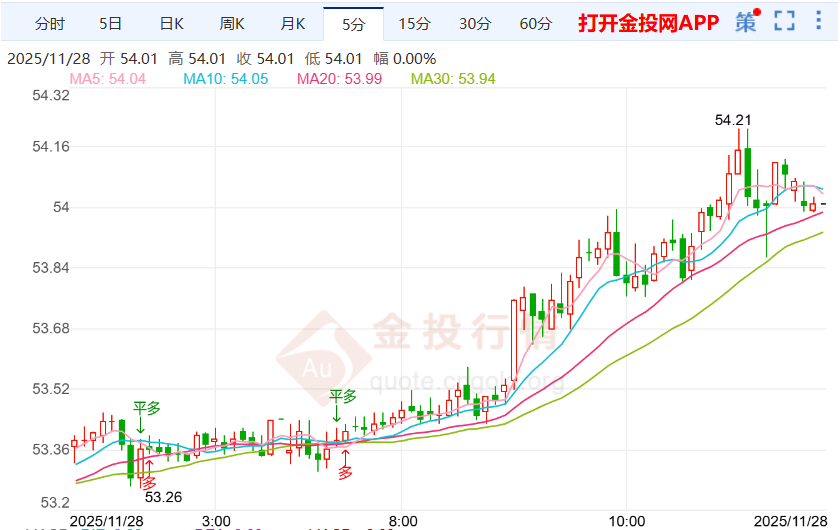 几位美联储官员最近表示愿意采取短期宽松政策,这加强了市场对美联储可能在12月会议上再次降息25个基点的预期。 这一前景继续对美元构成结构性压力,有助于限制白银的大幅回调。 与此同时,在对美联储宽松政策信心增强的推动下,全球股市人气改善,在一定程度上减少了对避险资产的需求。然 而,这种影响被持续存在的地缘政治风险部分抵消。这令投资者保持适度谨慎,间接支撑了白银。 美元指数近期下跌后趋于稳定,略高于本周低点。最近美国公布的经济数据,包括喜忧参半的制造业数据、劳动力市场 走软的迹象和消费势头减弱,强化了对美国经济放缓的预期。 据CME"美联储观察":美联储12月降息25个基点的概率为86.9%,维持利率不变的概率为13.1%。美联储到明年1月累计 降息25个基点的概率为67.3%,维持利率不变的概率为9.6%,累计降息50个基点的概率为23.1%。 今日周五(11月28日)亚盘时段,国际白银目前交投于53.81一线上方,今日开盘于53.35美元/盎司,截至发稿,国际白银 暂报54.01美元/盎司,上涨1.07%,最高触及54.22美元/盎司,最低下探53.30美元/盎司,目前来看,国际白银盘内短线 偏向震荡走势。 ...