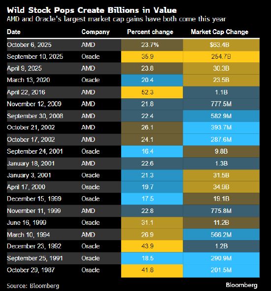 来源:环球市场播报 在OpenAI不断扩张、带动科技股大涨之际,投资者情绪高涨。但越来越多华尔街专业人士担心,那些 在短短几分钟内就能令市值增加数百亿美元的剧烈拉升,正在释放出不健康的信号,让人想起互联网泡 沫时期。 AMD公司周一也经历了这样的"火箭式"上涨。这家芯片制造商与OpenAI达成交易后,股价飙升,盘中 高位时公司市值一度增加约1000亿美元;该协议可能为其带来数十亿美元的营收。此前,甲骨文公司上 月曾单日大涨36%,一日之间为这家软件公司的市值增加了2550亿美元,起因是其对云业务给出了尤为 强劲的指引,其中包括与OpenAI达成的一项为期五年、价值3000亿美元的协议。 如今一旦开始去泡沫,冲击可能更为剧烈,因为主要科技股合计约占标普500指数的约35%,而1999年 时不到15%。 "市场给这些交易的定价,仿佛只要和OpenAI有往来,就一定会成为赢家,"Jonestrading首席市场策略 师Michael O'Rourke说道。"OpenAI是一家负现金流公司,签这些协议对它而言没有损失。投资者应该 更有鉴别力。但现在的环境是'先买了再说'。" 对冲基金亿万富豪Paul Tudor Jo ...