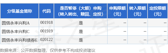 以上内容为证券之星据公开信息整理,由AI算法生成(网信算备310104345710301240019号),不构成 投资建议。 证券之星消息,9月3日圆信永丰基金管理有限公司发布《圆信永丰兴利债券型证券投资基金基金暂停 (大额)申购(转换转入、赎回、转换转出、定期定额投资)公告》。公告中提示,为了保证基金的平 稳运作,保护基金份额持有人利益,自2025年7月18日起圆信永丰兴利债券型证券投资基金基金暂停 (大额)申购(转换转入、赎回、转换转出、定期定额投资),下属分级基金调整明细如下: | 分级基金简称 | 代码 | 是否暂停(大额)申购 | 申购限额 转入限额 定投限额 | | | --- | --- | --- | --- | --- | | | | (转入转出、赎回、定投) | (元) (元) | (元) | | 员信永丰兴利A | 001918 | 를 | | | | 员信永丰兴利C | 001919 | 를 | | | | 圆信永丰兴利信券 020122 | | 를 | | | ...