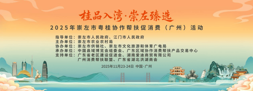 当崇左好物对接湾区市场,当壮锦纹样遇上岭南风情,一场跨越粤桂两地的协作盛宴于11月23日在广州隆重开 幕。"桂品入湾・崇左臻选"2025年崇左市粤桂协作帮扶促消费(广州)活动,以产销对接为核心,以农文旅融合为纽 带,吸引两地400余名政企代表、采购商及媒体参与,在广东区域协作消费帮扶产品交易中心搭建起粤桂协作新桥 梁。两天时间里,从特色展销到文旅推介,从项目签约到直播带货,全方位展现了崇左魅力,交出一份亮眼的协作答 卷。 开幕式启动仪式 本次活动由崇左市农业农村局主办,中国县域博览会组委会、广东区域协作消费帮扶产品交易中心承办,崇左市供销 社、崇左市文化旅游和体育广电局协办,广东省老区建设促进会、湖南爱迪商贸有限公司、广州消费帮扶联盟、广东 省湖北洪湖商会提供支持。 聚焦活动开幕,锚定协作发展新方向 开场的壮乡歌舞表演率先吸引全场目光——身着民族服饰的演员们以山歌对唱、绣球舞展现崇左文化特色,灵动的舞 姿与悠扬的旋律让现场观众沉浸式感受"边关风情"。 江门市农业农村局三级调研员张荣伟上台致辞表示,大湾区拥有庞大的消费市场和完善的产业链优势,而崇左则具备 绿色生态的农产品资源和独特的文旅禀赋,"此次活动既是对前 ...