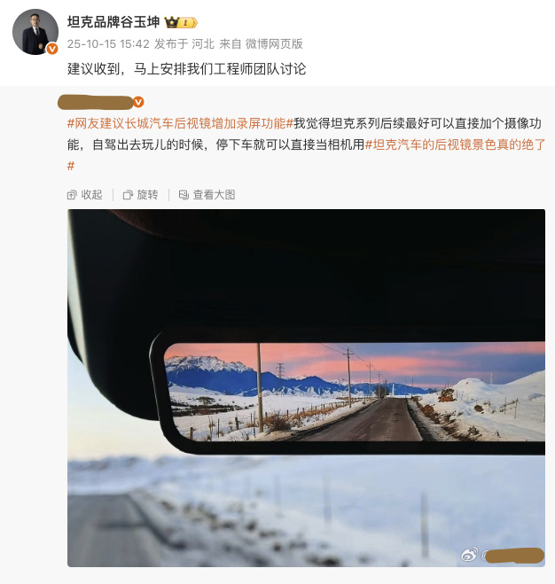 坦克品牌高管:安排工程师团队讨论后视镜增加录屏功能