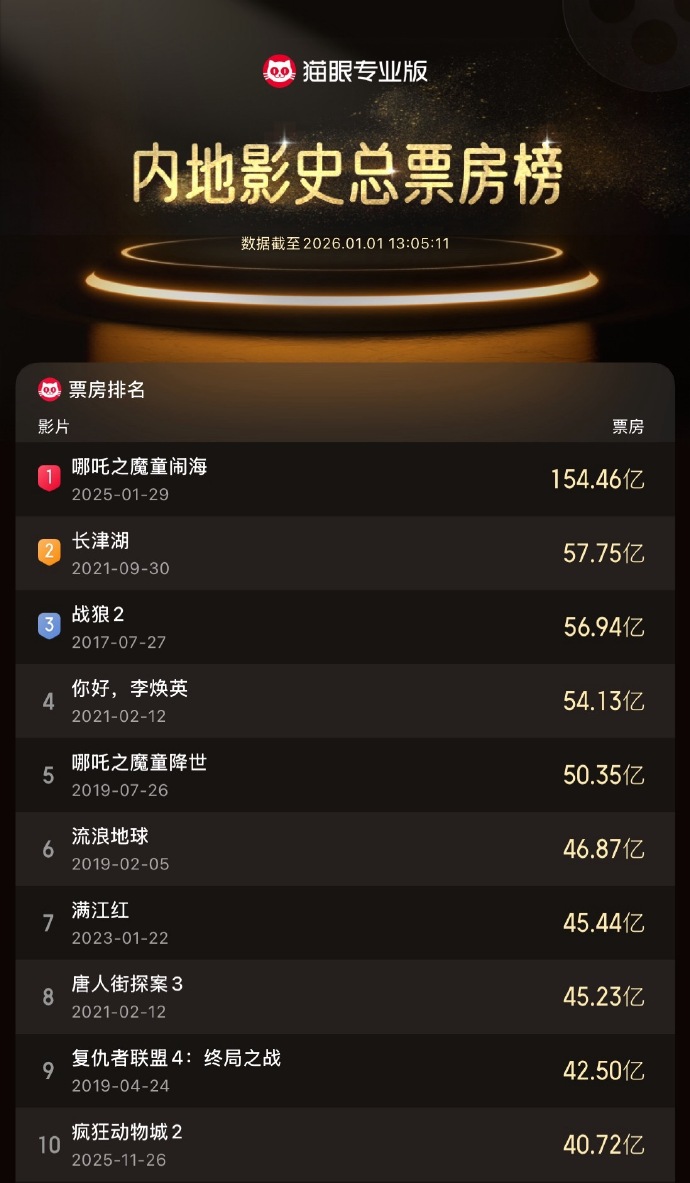 | 。 通眼专业版 | | | --- | --- | | 内地影史总票 | | | 数据截至2026.01.01 13:05:11 | | | 图 票房排名 | | | 影片 | 票房 | | 哪吒之魔童闹海 1 2025-01-29 | 154.46亿 | | 炭禁光 2 2021-09-30 | 57.75亿 | | 战狼2 3 | 56.94亿 | | 2017-07-27 | | | 你好,李焕英 4 | 54.13亿 | | 2021-02-12 | | | 哪吒之魔童降世 5 2019-07-26 | 50.35亿 | | 流浪地球 | | | 6 2019-02-05 | 46.87亿 | | 满江红 7 | 45.44亿 | | 2023-01-22 | | | 唐人街探案 3 Q | 15 2317 | | | 2021-02-12 | 40.6010 | | --- | --- | --- | | 9 | 复仇者联盟 4: 终局之战 | 42.50亿 | | | 2019-04-24 | | | 10 | 疯狂动物城2 2025-11-26 | 40.72亿 | 据猫眼专业版数据,电影《 ...