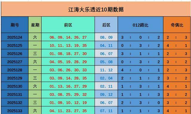2路号码,近10期表现较热,2路开出17个奖号,上期出号3枚,本期预计出号减少。推荐关注2路奖号 23。 前区奇偶分析:上期红球开出奇数4个,偶数1个,奇偶比4:1,近10期奇偶比30:20,奇数走势占优, 本期预计奇偶比4:1 后区分析: | | | | 江涛大乐透近10期数据 | | | | | | | | | | --- | --- | --- | --- | --- | --- | --- | --- | --- | --- | --- | --- | | 期号 | 星期 | 前区 | 后区 | | | 012路比 | | | | 奇偶比 | | | 2025124 | 六 | 06、09、14、26、27 | 08、09 | 3 | 2 | 0 5 | | 2 | 2 | : | 8 | | 2025125 | 1 | 10、11、13、19、35 | 04、11 | 0 | : | 3 | : | 2 | 4 | 3 | म | | 2025126 | 111 | 01、08、18、27、30 | 06、07 | 3 | . | A | " | 2 | 2 | : | 3 | | 2025127 ...
