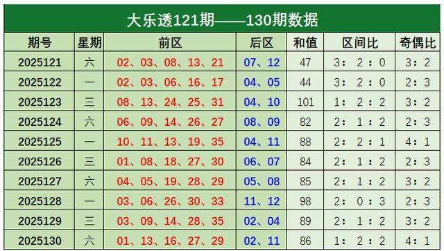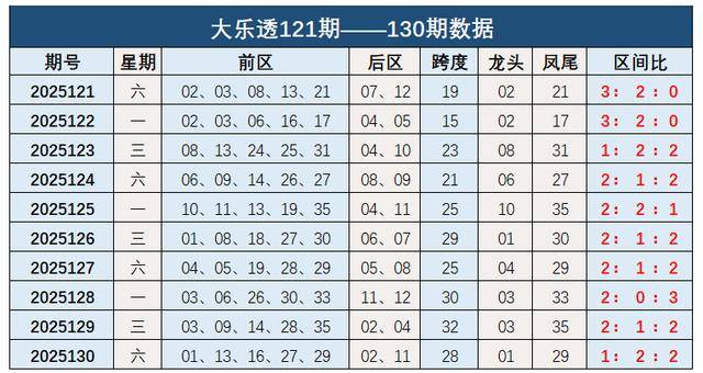 | | | 大乐透121期 | | -130期数据 | | | | | --- | --- | --- | --- | --- | --- | --- | --- | | 期号 | 星期 | 前区 | 后区 | 跨度 | 龙头 | 凤尾 | 区间比 | | 2025121 | 六 | 02、03、08、13、21 | 07、12 | 19 | 02 | 21 | 3: 2:0 | | 2025122 | - | 02、03、06、16、17 | 04、05 | 15 | 02 | 17 | 3: 2:0 | | 2025123 | IH | 08、13、24、25、31 | 04、10 | 23 | 08 | 31 | 1: 2:2 | | 2025124 | 六 | 06、09、14、26、27 | 08、09 | 21 | 06 | 27 | 2: 1 : 2 | | 2025125 | 1 | 10、11、13、19、35 | 04、11 | 25 | 10 | 35 | 2: 2 : 1 | | 2025126 | 三 | 01、08、18、27、30 | 06、07 | 29 | 01 | 30 | ...