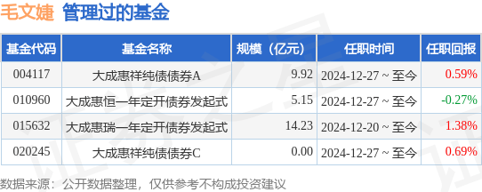 | 基金代码 | 基金名称 | 规模(亿元) 任职时间 | 任职回报 | | --- | --- | --- | --- | | 004117 | 大成惠祥纯债债券A | 9.92 2024-12-27 ~ 至今 | 0.59% | | 010960 | 大成惠恒一年定开债券发起式 | 5.15 2024-12-27 ~ 至今 | -0.27% | | 015632 | 大成惠瑞一年定开债券发起式 | 14.23 2024-12-20~至今 | 1.38% | | 020245 | 大成惠祥纯债债券C | 0.00 2024-12-27 ~ 至今 | 0.69% | 以上内容为证券之星据公开信息整理,由AI算法生成(网信算备310104345710301240019号),不构成 投资建议。 证券之星消息,2025年8月20日,大成通嘉三年定开债券(008003)发布公告,增聘毛文婕为基金经 理,任职日期自2025年8月20日起,变更后大成通嘉三年定开债券(008003)的基金经理为毛文婕,曾婷 婷。截止2025年8月19日,大成通嘉三年定开债券净值为1.1780,较上一日上涨0.01%,近一年上涨 3.0%。 ...