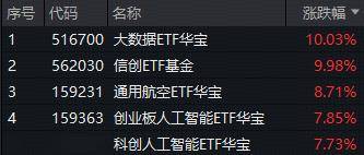 太强了!今日(1月9日),AI应用端大涨,聚焦数据技术、数据安全领域的大数据ETF华宝(516700) 场内价格暴拉3.92%,冲击日线11连阳! | 序号 | 名称 | 深跌幅 ▼ | 開日留 | 申万一级行业 | 申万二级行业 | 申万三级行业 | 总市值 | 成交額 | | --- | --- | --- | --- | --- | --- | --- | --- | --- | | 1 | 易点大下 | 20.00% | | 传媒 | 广告营销 | 营销代理 | 249亿 | 61.17亿 | | 2 | 润滑材技 | 15.53% | | 酒信 | 通信服务 | 通信应用增值服务 | 1129亿 | 71.99亿 | | 3 | 税友股份 | 10.00% | Arthand of | 计算机 | IT服务Ⅱ | IT服务Ⅲ | 289亿 | 5.80亿 | | 4 | 良飞致招 | 9.71% | mar | 通信 | 通信服务 | 通信应用增值服务 | 224亿 | 32.92亿 | | રે | 深信服 | 8.30% | --- | 计算机 | 软件开发 | 標向通用软件 | 557亿 | ...