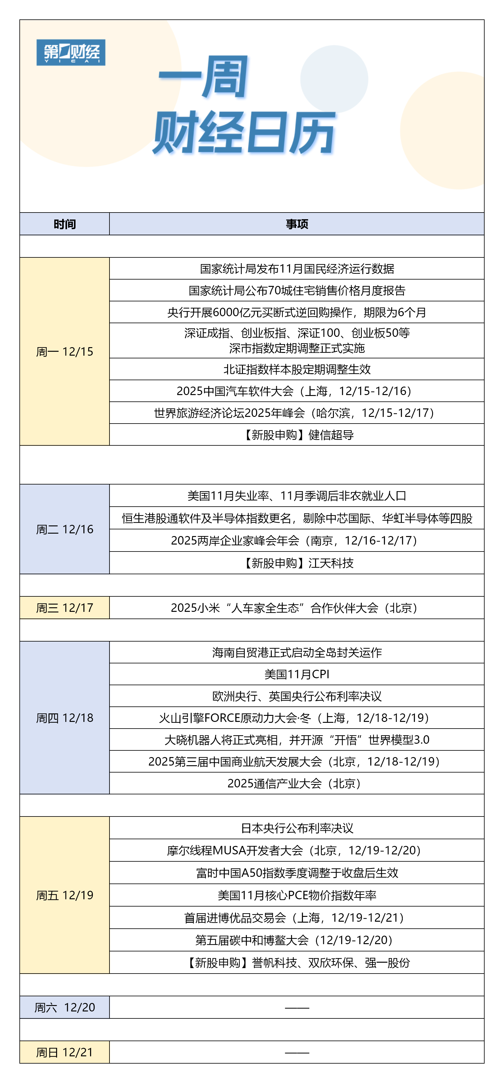 11月国民经济运行数据将发布;海南自贸港将正式启动全岛封关运作;5只新股将开启申购…… | 周二 12/16 | 美国11月失业率、11月季调 | | --- | --- | | | 恒生港股通软件及半导体指数更名,剔除中 | | | 2025两岸企业家峰会年会(南京 | | | 【新股申购】 江天 | | 周三 12/17 | 2025小米"人车家全生态" 合作 | | 周四 12/18 | 海南自贸港正式启动全岛 | | | 美国11月CPI | | | 欧洲央行、英国央行公布 | | | 火山引擎FORCE原动力大会·冬(上 | | | 大晓机器人将正式亮相,并开源 | | | 2025第三届中国商业航天发展大会( | | | 2025通信产业大会( | | 周五 12/19 | 日本央行公布利率 | | | 摩尔线程MUSA开发者大会(北京 | | | 富时中国A50指数季度调整 | | | 美国11月核心PCE物价: | | | 首届进博优品交易会(上海, | | | 第五届碳中和博鳌大会(12 | | | 【新股申购】 誉帆科技、双欣 | | --- | --- | | 周六 12/20 | | ...