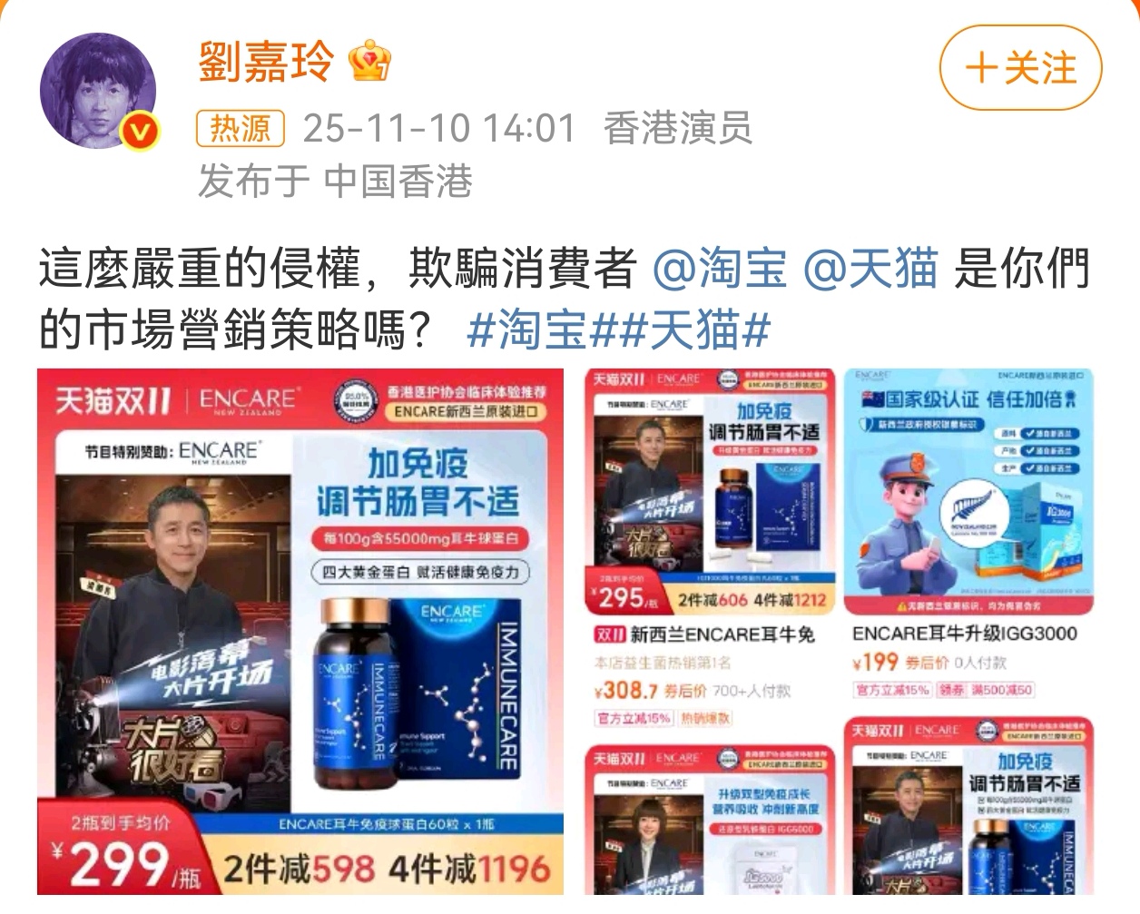 刘嘉玲喊话淘宝、天猫:欺骗消费者