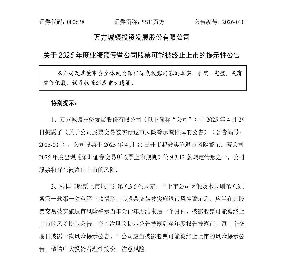又一家公司可能触及财务类终止上市情形。 1月13日晚间,*ST万方(000638)发布公告称,经公司财务部门初步测算,公司预计2025年度营业收入 不足3亿元且扣非前后净利润均为负,可能触及财务类终止上市情形。 此外,*ST万方还面临被实施重大违法强制退市的风险。公告显示,公司于2025年7月25日收到中国证监 会下发的《中国证券监督管理委员会立案告知书》,因涉嫌信息披露违法违规,中国证监会决定对公司 立案。截至本公告披露日,中国证监会的调查尚在进行中,公司尚未收到就上述立案事项的结论性意见 或决定。若后续经中国证监会行政处罚且相关认定的事实触及《深圳证券交易所股票上市规则》规定的 重大违法强制退市情形时,公司股票可能被实施重大违法强制退市。 公开资料显示,*ST万方是一家以农业和军工业务为主的公司,公司农业业务的经营模式是利用属地农业 资源优势收购玉米及水稻原粮,玉米经过分拣、烘干和筛选等工序,按照大型加工厂或者相关客户的要 求供应成货,水稻原粮则加工成大米自主销售;军工板块的主营业务是为航空、航天、船舶、兵装行业 的飞行器、航行器、舰船、车载装备中的轻量化、高精度、高强度重要金属结构和功能部件提供精密加 ...