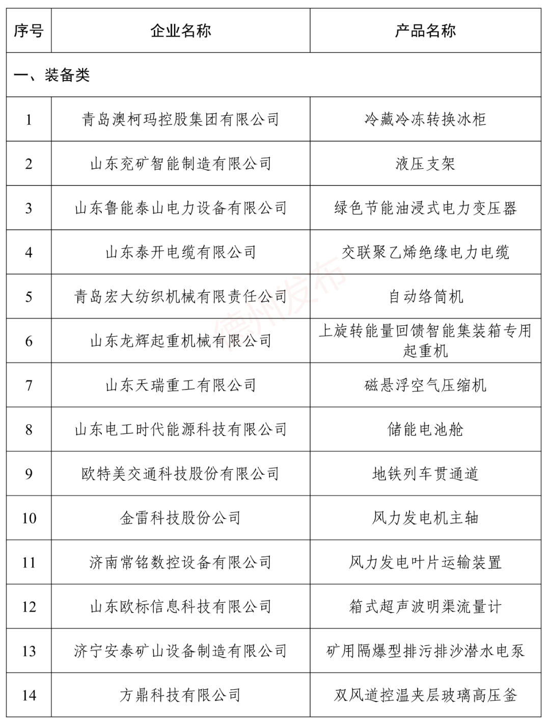 | 序号 | 企业名称 | 产品名称 | | --- | --- | --- | | 一、装备类 | | | | 1 | 青岛澳柯玛控股集团有限公司 | 冷藏冷冻转换冰柜 | | 2 | 山东兖矿智能制造有限公司 | 液压支架 | | 3 | 山东鲁能泰山电力设备有限公司 | 绿色节能油浸式电力变压器 | | イ | 山东泰开电缆有限公司 | 交联聚乙烯绝缘电力电缆 | | 5 | 青岛宏大纺织机械有限责任公司 | 自动络简机 | | 6 | 山东龙辉起重机械有限公司 | 上旋转能量回馈智能集装箱专用 起重机 | | 7 | 山东天瑞重工有限公司 | 磁悬浮空气压缩机 | | 8 | 山东电工时代能源科技有限公司 | 储能电池舱 | | 9 | 欧特美交通科技股份有限公司 | 地铁列车贯通道 | | 10 | 金雷科技股份公司 | 风力发电机主轴 | | 11 | 济南常铭数控设备有限公司 | 风力发电叶片运输装置 | | 12 | 山东欧标信息科技有限公司 | 箱式超声波明渠流量计 | | 13 | 济宁安泰矿山设备制造有限公司 | 矿用隔爆型排污排沙潜水电泵 | | 14 | 方鼎科技有限公司 | 双风道 ...