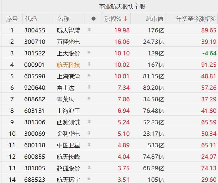 格隆汇11月3日|A股市场商业航天股集体走强,其中,航天智装20CM涨停,万隆光电涨16%,上大股份 涨超10%,航天科技、上海港湾10CM涨停,富士达、霍莱沃涨超7%,上海沪工涨超6%,西测测试、金 利华电涨超5%。 消息面上,中国载人航天工程办公室表示,明年将组织4次飞行任务,包括发射天舟10号货运飞船、神舟 22号及23号载人飞船,以及梦舟1号载人飞船。办公室昨日启动4次飞行任务标识征集活动。 根据任务规划,神舟22号及神舟23号,将在酒泉卫星发射中心发射,均由3名航天员组成飞行乘组,当中 神舟22号其中1名航天员,会开展1年以上长期驻留试验。 | | | | | 商业航天板块个股 | | | | --- | --- | --- | --- | --- | --- | --- | | 序号 代码 | | 名称 | . | 涨幅%↓ | 总市值 | 年初至今涨幅% | | 1 | 300455 | 航天智装 | 1 | 19.98 | 176亿 | 89.65 | | 2 | 300710 | 万隆光电 | | 16.06 | 24.73 乙 | 39.19 | | 3 | 301522 | 上大股份 | ...