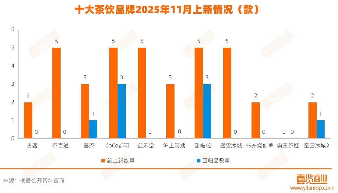 进入11月,茶咖行业围绕秋冬限定展开了一场激烈的新品竞赛。 据茶咖观察统计,今年11月,全国门店数量排名前十的茶咖品牌合计推出76款新品。其中,茶饮品牌共上新37款产品,包含7款回归产品;咖啡品牌上新39 款产品,包含5款回归产品。 茶饮品牌中,CoCo都可、茶百道、沪上阿姨、蜜雪冰城、甜啦啦、益禾堂都推出5款新品,其次是喜茶,推出3款新品;书亦烧仙草和古茗紧随其后,均上 新2款;咖啡品牌中,肯悦咖啡、瑞幸、星巴克均有7款新品上市;Times天好咖啡和库迪紧跟其后,均上新5款产品。霸王茶姬、沪咖已连续3个月没有上 新。 在延续了10月醇厚风味基调的同时,市场呈现"暖养"与"轻果"两种趋向:茶饮忙着"加料"养生,咖啡用果咖新品为冬季带来了"清爽感"。 茶饮领域,契合冬季的温暖热饮仍在持续增长,11月共推出20款奶茶新品,占茶饮新品总量的54.05%;其中中式糖水饮品成为今年秋冬的新潮流,共上市8 款新品,占茶饮新品总量的21.62%。 咖啡领域,本月共推出18款奶咖新品(含1款回归),占咖啡新品总量的46.15%;果咖新品也有增长,共推出9款奶咖新品(含3款回归),占咖啡新品总量 的23.07%。 茶底应用方面 ...