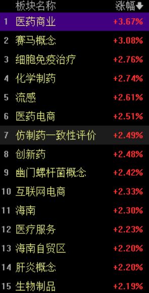 11月26日,医药股集体走强,医药商业、化学制药、流感、创新药等方向涨幅居前。 | 板块名称 | 涨幅 | | --- | --- | | 1 医药商业 | +3.67% | | 2 赛马概念 | +3.08% | | 3 细胞免疫治疗 | +2.76% | | 化学制药 4 | +2.74% | | 5 流感 | +2.61% | | 6 医药电商 | +2.51% | | 7 仿制药一致性评价 | +2.49% | | 8 创新药 | +2.48% | | 9 幽门螺杆菌概念 | +2.42% | | 10 互联网电商 | +2.33% | | 11 海南 | +2.30% | | 12 医疗服务 | +2.23% | | 13 海南自贸区 | +2.20% | | 14 肝炎概念 | +2.20% | | 15 生物制品 | +2.19% | 截至发稿,华人健康、海王生物、人民同泰、瑞康医药、海南海药、广济药业等多股涨停。 截至发稿,沪指跌0.03%,深成指涨0.84%,创业板指涨1.52%。 | 代码 名称 | 现价 涨跌 | | --- | --- | | 000001 上证指数 | 3868.95 ...