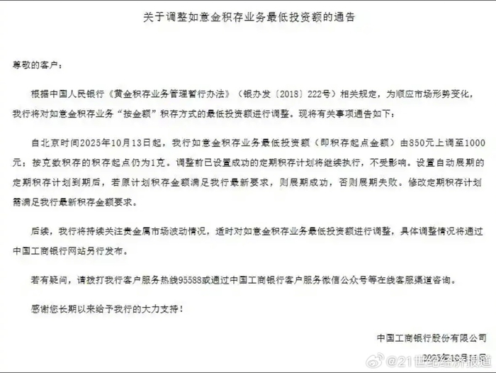 【#工商银行上调积存金起购点#】工商银行网站11日发布通告,为顺应市场形势变化,我行将对如意金 积存业务"按金额"积存方式的最低投资额进行调整:自北京时间2025年10月13日起,该行如意金积存业 务最低投资额(即积存起点金额)由850元上调至1000元;按克数积存的积存起点仍为1克。 ...
