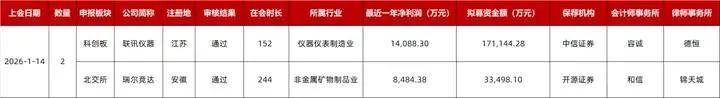 据交易所官网审核动态信息,1月14日,2家IPO企业上会获审核通过。 | | | | 上会日期 数量 申报板块 公司简称 注册地 审核结果 在金时长 | | | 保存机构 会计师事务所 律师事务所 | | | | --- | --- | --- | --- | --- | --- | --- | --- | --- | | 2026-1-14 2 | 科创板 联讯仪器 江苏 | 通过 | 52 3 仪器仪表制造业 | 14,088,30 | 171,144.28 | 中信证券 | 居酒 | 领悟 | | | 北交所 瑞尔竞达 安徽 | 通过 | 244 非金属矿物制品业 | 8,484.38 | 33,498.10 | 开源证券 | 和值 | 辖天城 | 其中,苏州联讯仪器股份有限公司(简称:联讯仪器)为2026年科创板首家上会企业。过会前完成两轮 审核问询答复,主要聚焦公司技术先进性、核心竞争力,是否掌握关键核心技术等问题;此外,公司募 投项目必要性被连续问询。 更新后的招股书显示,联讯仪器在完成第二轮问询答复前调整了部分募投项目并取消"补充流动资金"项 目,拟募资总额从19.54亿元降至17.11亿元。 ...