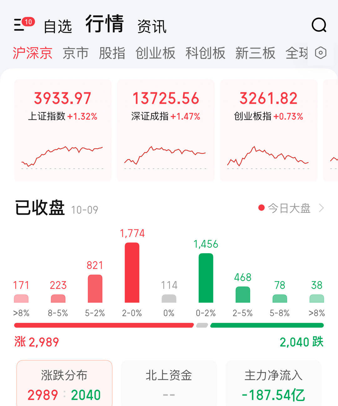 以海风为首的风电股持续走强,金风科技午后拉升涨停,运达股份、广大特材、三一重能、大金重工、吉鑫科技等涨超5%。消息面上,国内海风市场9月 迎来招中标高峰期,中国首个国家级海上风电试验基地即将投运,可开展目前世界最大容量风电机组和最长尺寸风机叶片的检测试验,以及多领域国际前 沿技术研究。 展望后市,机构普遍对A股"红十月"抱以乐观的展望。申万宏源研报称,"红十月"是大概率事件,10月科技产业催化和长期政策布局窗口有望共振,市场 结构性行情可能重新升温。 兴业证券认为,10月市场进入三季报交易窗口,这有望带动资金聚焦景气线索,成为"破局"重要抓手。对于科技、先进制造为代表的强势板块,三季报是 验证其景气周期的重要窗口。 扬子晚报网10月9日讯(记者 范晓林 实习生 魏静萱)10月9日是国庆中秋黄金周假期后首个交易日,A股沪指盘中突破3900点,再创年内新高。截至收 盘,上证指数收于3933.97点,涨幅1.32%,这也是自2015年8月以来,上证指数再次突破3900点。沪深两市成交额连续第15个交易日突破2万亿,全天成交 金额2.65万亿。 截至收盘,沪指涨1.32%,报3933.97点,深成指涨1.47%,报1 ...