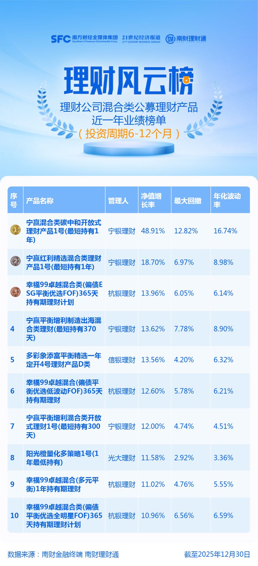集团 21世纪经济报道 公司混合类公墓理财 近一年业绩榜单 投资周期6-12个月 | F 특 | 产品名称 | 净值增 管理人 长李 | 最大回撤 | 年化波动 MI | | --- | --- | --- | --- | --- | | | 一赢混合类碳中和开放式 Furth Lass I | 宁银理财 48.91% 12.82% | | 16.74% | | | स्टे) | | | | | | 宁赢红利精选混合类理财 File ( | 宁银理财 18.70% | 6.97% | 8.98% | | | 幸福99卓越撮合英(偏债E SG平衡优选FOF)365天 杭银理财 13.96% | | 6.05% | 6.14% | | | 持有期理财计划 | | | | | 4 | 宁赢平衡增利制造出海泥 合类理财(最短持有370 | 宁银理财 13.62% | 7.78% | 8.90% | | | R | | | | | 5 | 多彩象添富平衡精选 ਦੇ | 信银理财 13.56% 4.20% | | 6.32% | | | 元开4号 - w 产品 DS | | | | | 6 | 幸福99卓越混合(偏债平 ...