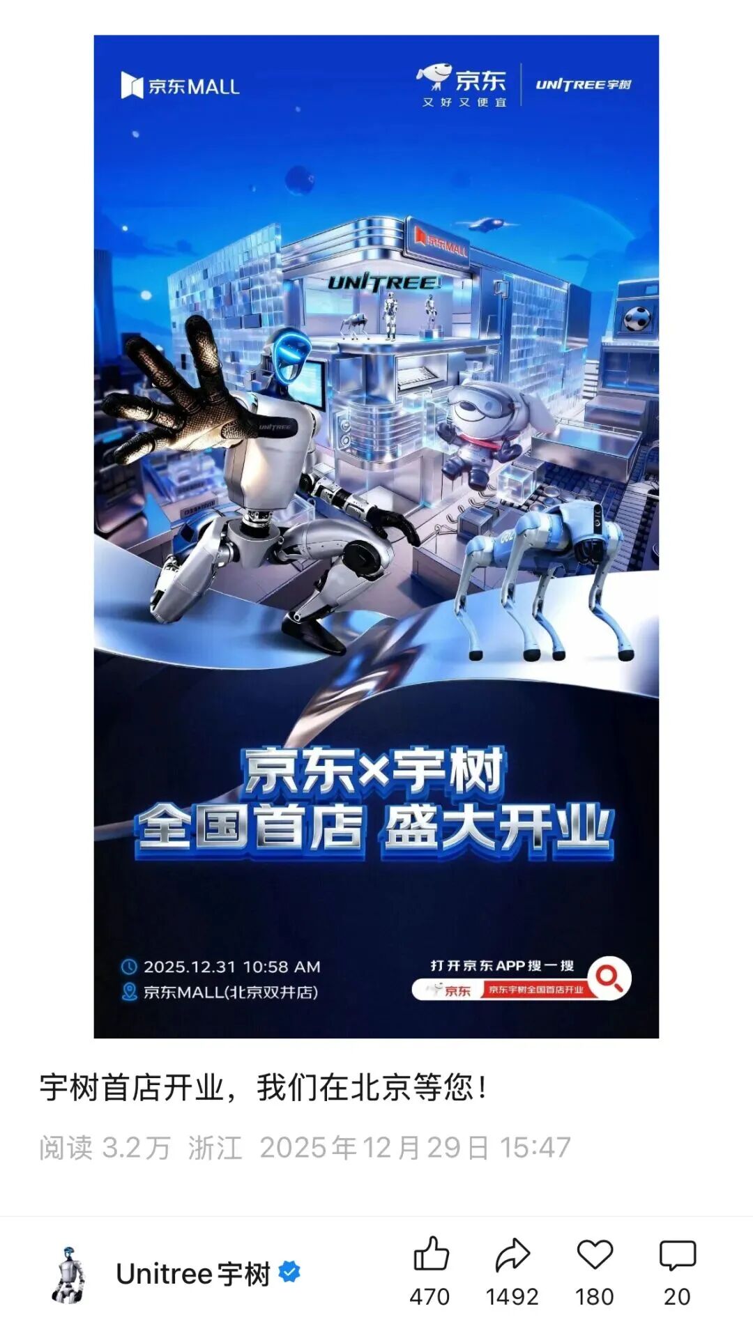 记者丨曾静娇 编辑丨刘雪莹 备受关注的宇树科技又有大动作。 12月29日,宇树官方微信公众号发布消息称,其全国首店将于12月31日在北京京东MALL开业。该门店是京东与宇树科技全球首 店,集中展示宇树Go2四足机器狗、G1人形机器人等多款明星产品。 (声明:文章内容仅供参考,不构成投资建议。投资者据此操作,风险自担。) SFC 出品丨21财经客户端 21世纪经济报道 宇树科技成立于2016年8月26日,是一家聚焦消费级、行业级高性能通用足式/人形机器人及灵巧机械臂自主研发、生产与销售的高 新技术企业,由王兴兴创立。 相比于其他的人形机器人公司,宇树科技在商业化方面的进度更为快速。在今年6月举行的天津夏季达沃斯论坛上,宇树科技创始人 王兴兴首次公开披露公司最新经营数据:2024年度营收已突破10亿元人民币,较前一年实现显著增长,是业内少数实现盈利的机器 人企业。另据公开信息,宇树科技明星产品Unitree Go1四足机器人累计出货量超5万台,占据全球消费级足式机器人市场60%以上份 额。此外,宇树科技在工业、巡检、物流等场景的机器人解决方案也已实现规模化应用。 目前宇树机器人的IPO亦进入加速度阶段。 11月1 ...