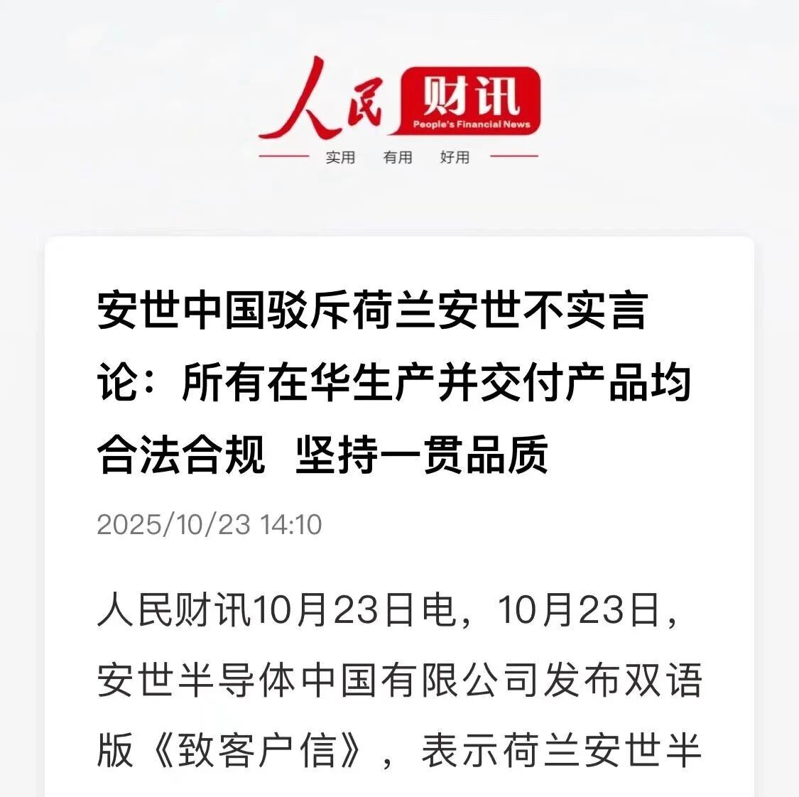 公司坚决反对,并将采取一切手段依法维权。 据人民财讯消息,10月23日,安世半导体中国有限公司发布双语版《致客户信》,表示荷兰安世半导体现任管理层散布与事实不符的信息,无端质疑产品合 规性、质量标准和技术能力,企图混淆视听,干扰客户正常采购决策。对此公司坚决反对,并将采取一切手段依法维权。 同时,安世半导体中国有限公司承诺,所有在华生产并交付的产品均符合中国法律法规及相关监管部门的要求,完全满足安世一贯的技术标准、生产工艺及 品质要求,符合与客户合同的各项约定,并在出厂检验环节通过公司的严格质量检验。 后续关于产品供应、生产工艺、技术标准等如有变更或调整,公司将会按照正常流程与客户提前沟通。 目前,安世半导体中国实体各项生产经营正有序推进,公司董事会、管理层及全体员工正尽最大努力致力于保障广大客户供应链稳定。 信息,九骊质辩广品合规性、质童 标准和技术能力,企图混淆视听, 干扰客户正常采购决策。对此公司 坚决反对,并将采取一切手段依法 维权。同时,安世半导体中国有限 公司承诺,所有在华生产并交付的 产品均符合中国法律法规及相关监 管部门的要求,完全满足安世一贯 的技术标准、生产工艺及品质要 求,符合与客户合同 ...