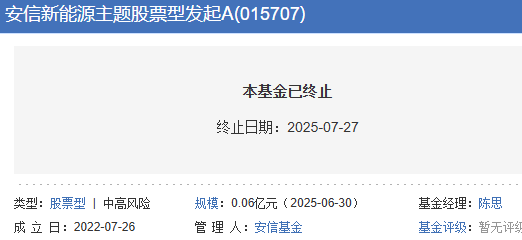中国经济网北京7月30日讯 近日,安信基金发布关于安信新能源主题股票型发起式证券投资基金基 金合同终止及基金财产清算的公告。 | 基金名称 | 安信新能源主题股票型发起式证券投资基金 | | --- | --- | | 基金简称 | 安信新能源主题股票型发起 | | 基金主代码 | 015707 | | 基金运作方式 | 契约型开放式 | | 基金合同生效日 | 2022年7月26日 | | 基金管理人名称 | 安信基金管理有限责任公司 | | 基金托管人名称 | 招商银行股份有限公司 | | 基金登记机构名称 | 安信基金管理有限责任公司 | | 公告依据 | 《中华人民共和国证券投资基金法》、《公开募集证券 | | | 投资基金运作管理办法》、《公开募集证券投资基金信 | | | 息披露管理办法》、《安信新能源主题股票型发起式证 | | | 券投资基金基金合同》、《安信新能源主题股票型发起 | | | 式证券投资基金招募说明书》及相关公告 | 来源:公告 公告称,安信新能源主题股票型发起式证券投资基金(以下简称"本基金")截至2025年7月26日, 基金资产净值低于2亿元,已触发《基金合同》中约定的基金终 ...